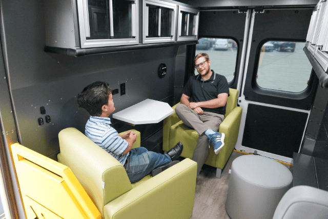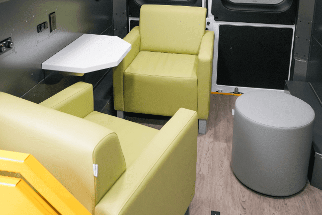 These vehicles are made to feel private, safe, and welcoming. Inside, there’s space for a therapist and a client to sit and talk, just like they would in an office. It’s like a mobile therapy center on wheels.
